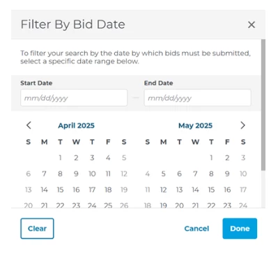 New Date Filters: New date filters let you narrow your search by picking specific dates, like the bid date, pre-bid meeting date, or when the project was added. You can also choose time ranges like the past 7 or 30 days.